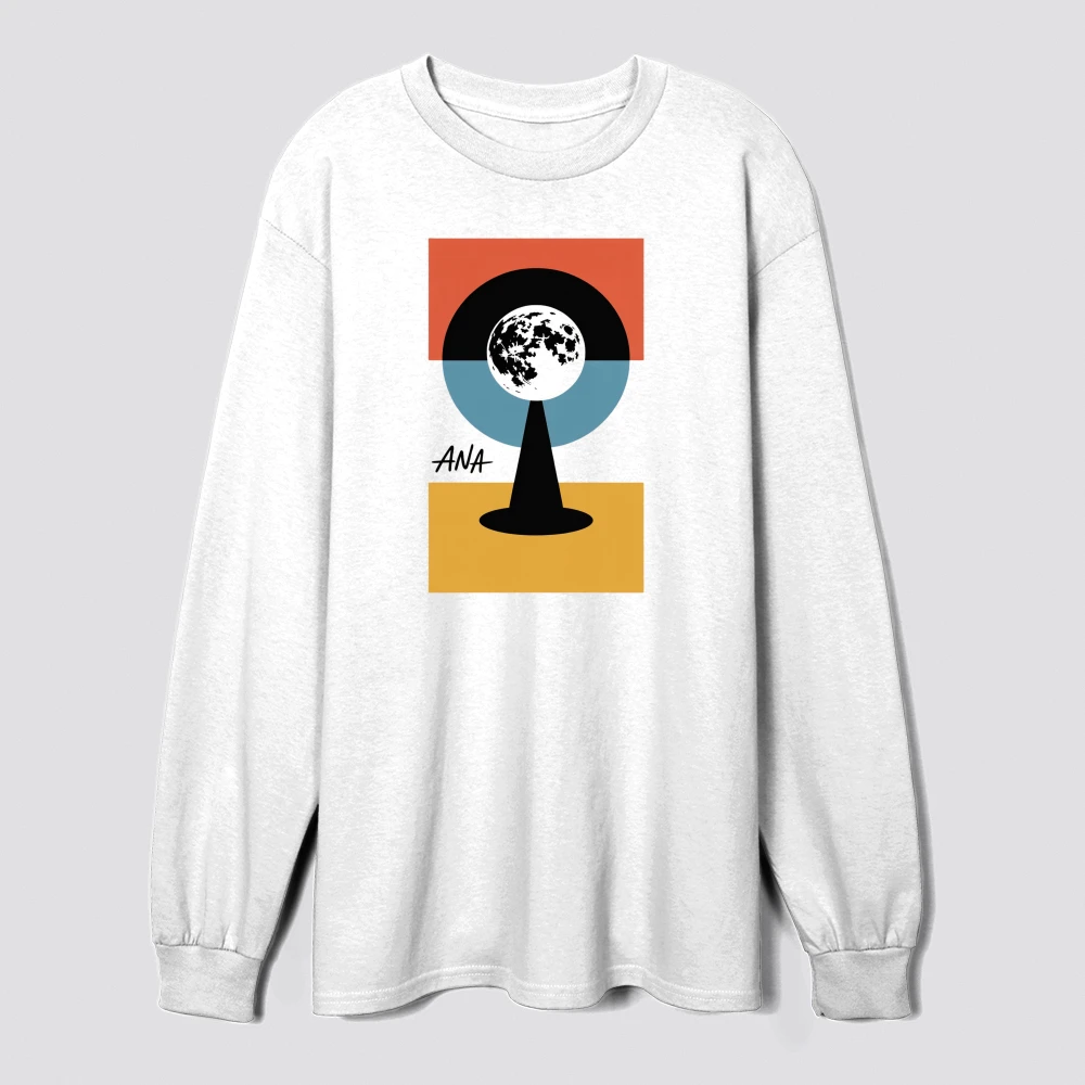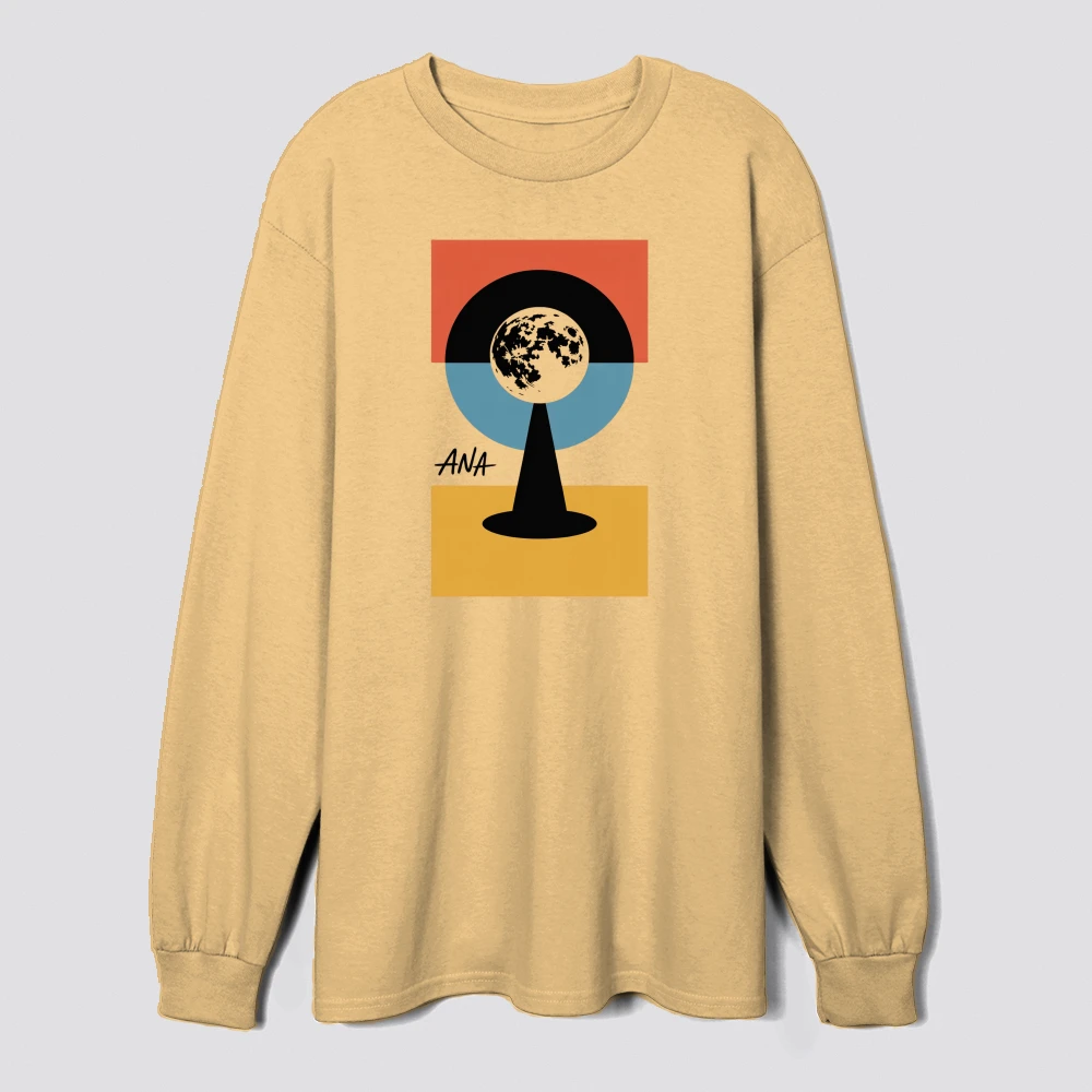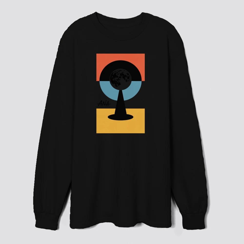 this artwork features a geometric design with the earth at its center surrounded by bold orange blue and black shapes blending abstract and minimalist styles