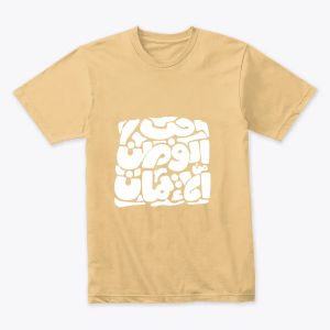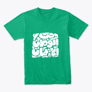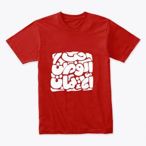 تصميم فني عربي بخلفية سوداء وكتابة بيضاء، تم فيه استخدام نمط الخط العربي الحديث بتنسيق عضوي متداخل (organic typographic layout)، حيث تشكل الحروف مساحة مربعة تقريبًا، ما يعطيه لمسة عصرية مميزة. الرسالة القوية والبسيطة: حب الوطن جزء من الإيمان، تعكس القيم الدينية والوطنية في آن واحد، بطريقة شبابية جذابة. هاد النوع من التصميم كيتلبس بزاف في التيشيرتات أو السترات في المناسبات الوطنية، الدينية أو حتى الحياة اليومية.