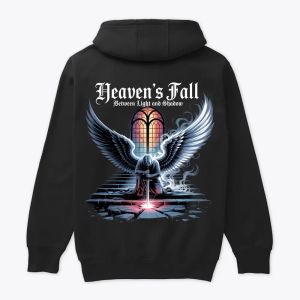 This black hoodie features the powerful "Heaven’s Fall: Between Light and Shadow" artwork, blending gothic fantasy and divine symbolism. The design showcases a kneeling angel with vast wings, gripping a glowing sword, set against a dramatic stained-glass backdrop. The ethereal contrast of light and shadow enhances the mystical atmosphere, making it perfect for fans of fantasy, gothic art, and bold streetwear. Crafted for both comfort and style, this hoodie merges storytelling with fashion, making it a standout statement piece.