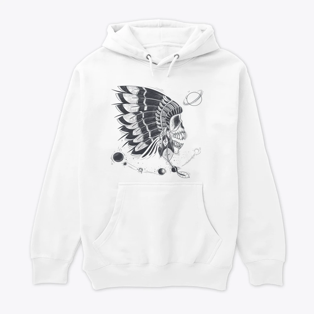 تصميم فني يمزج بين رمزية قائد القبائل الأصلية (Native Chief) وجمالية الكون والفضاء. يظهر المحارب مرتدياً قبعة الريش التقليدية محاطاً بالكواكب والأقمار. إنه تعبير عن العلاقة العميقة بين الإنسان والطبيعة والغموض الكوني.