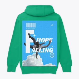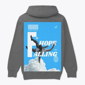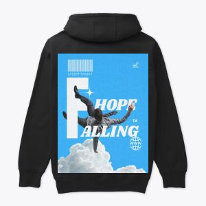 Challenge perceptions with the HOPE FALLING™ // Surreal Sky Hoodie. This striking back graphic features a stylized, barcode-framed design depicting a figure in a suit mid-fall, descending towards soft clouds against a brilliant blue sky. The bold text "HOPE FALLING™" creates a powerful, introspective statement about resilience and uncertainty in the modern world, underscored by a subtle globe icon and digital elements. It's a blend of surreal art and contemporary commentary, designed for those who appreciate depth and a unique perspective in their fashion. Crafted from comfortable, high-quality fabric, this hoodie isn't just clothing—it's a conversation starter.