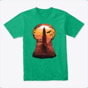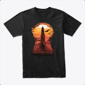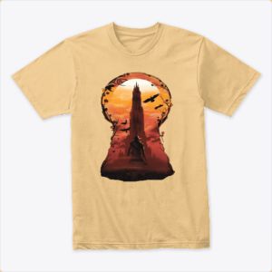This T-shirt design, titled "Keyhole to the Dark Tower," features a captivating and mysterious scene framed within the silhouette of a keyhole. The design draws the viewer into a dramatic world where a lone figure, reminiscent of a wandering cowboy or adventurer, stands before a towering, ominous structure bathed in the warm, eerie glow of a setting sun. The surrounding elements, including swirling vines, flowers, and crows in flight, add a gothic touch, enhancing the sense of mystery and foreboding. With its deep reds, oranges, and blacks, this design is perfect for those who appreciate dark fantasy, adventure, and the allure of the unknown.
