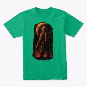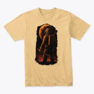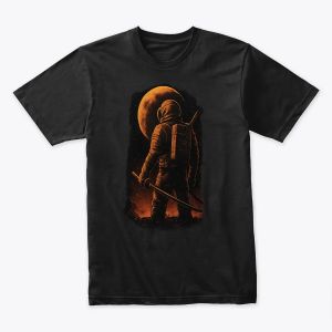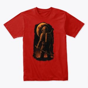 Un astronaute solitaire, dos à l’observateur, se tient fermement sur un sol extraterrestre. Son katana dégainé reflète une lumière orangée, tandis qu’il fait face à une lune imposante et menaçante dans l’espace. Évoquant à la fois la figure du rônin et celle du voyageur interstellaire, cette image symbolise la solitude, la détermination et la vigilance dans un monde futuriste et hostile.