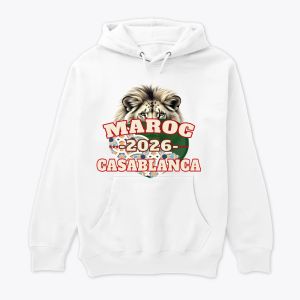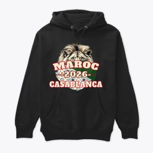 Show your Moroccan pride with this MOROCCO 2026 – CASABLANCA retro sport design. Featuring a powerful lion symbol and a vintage football badge inspired by Moroccan patterns, this artwork represents strength, heritage, and national pride. Perfect for football fans, streetwear lovers, and anyone connected to Morocco, this hoodie or sweatshirt blends retro sports aesthetics with modern urban style. A timeless design made for everyday wear or special football moments.