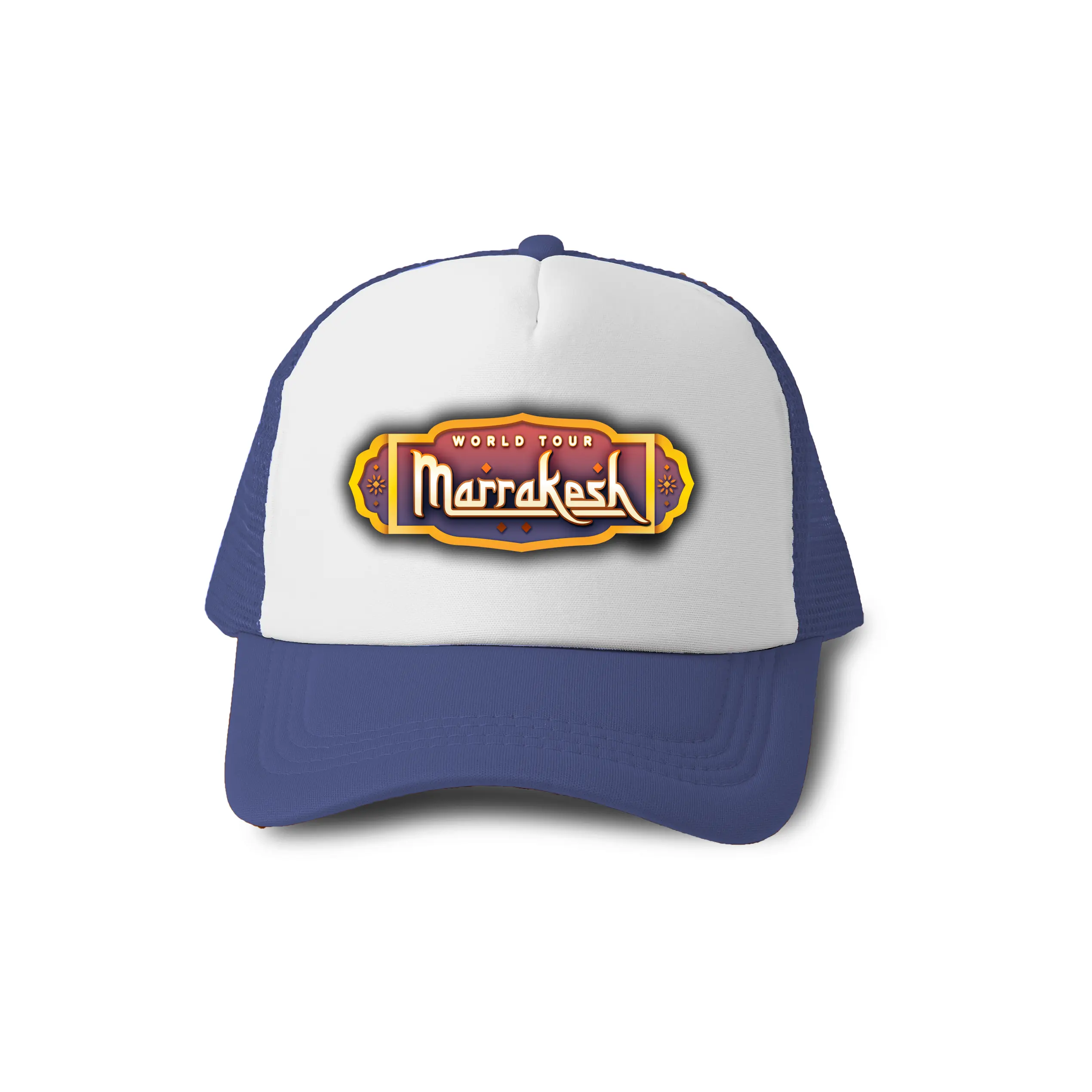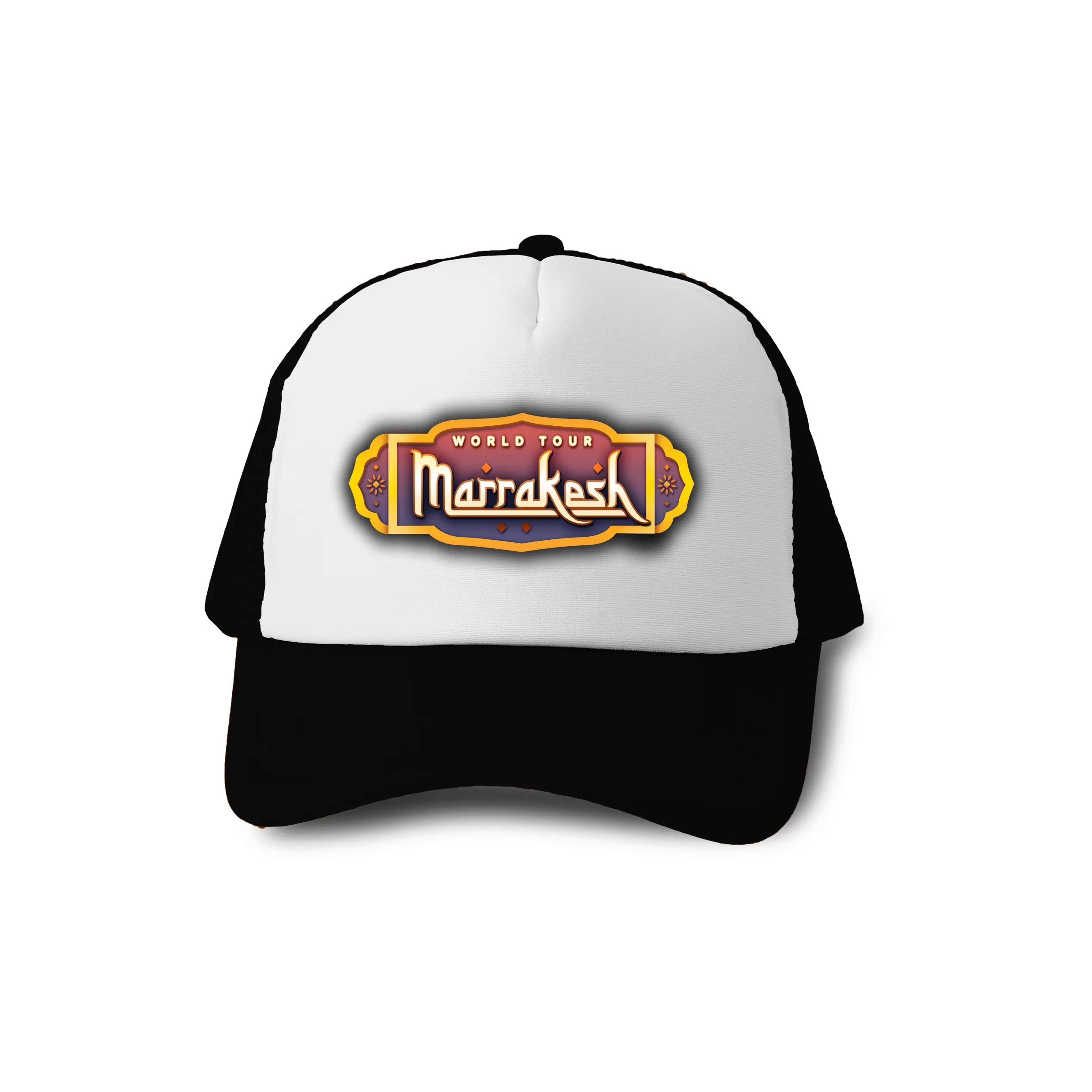 a stylized emblem for the marrakesh world tour featuring decorative typography and design elements highlighting the cultural and vibrant essence of marrakesh