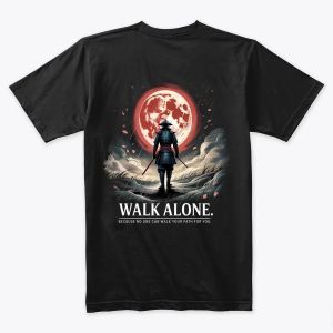 A powerful samurai stands beneath a blood-red moon, symbolizing strength, solitude, and purpose. “Walk Alone” reminds you that your journey is yours alone — no one can walk your path for you. Perfect for those who chase their own destiny