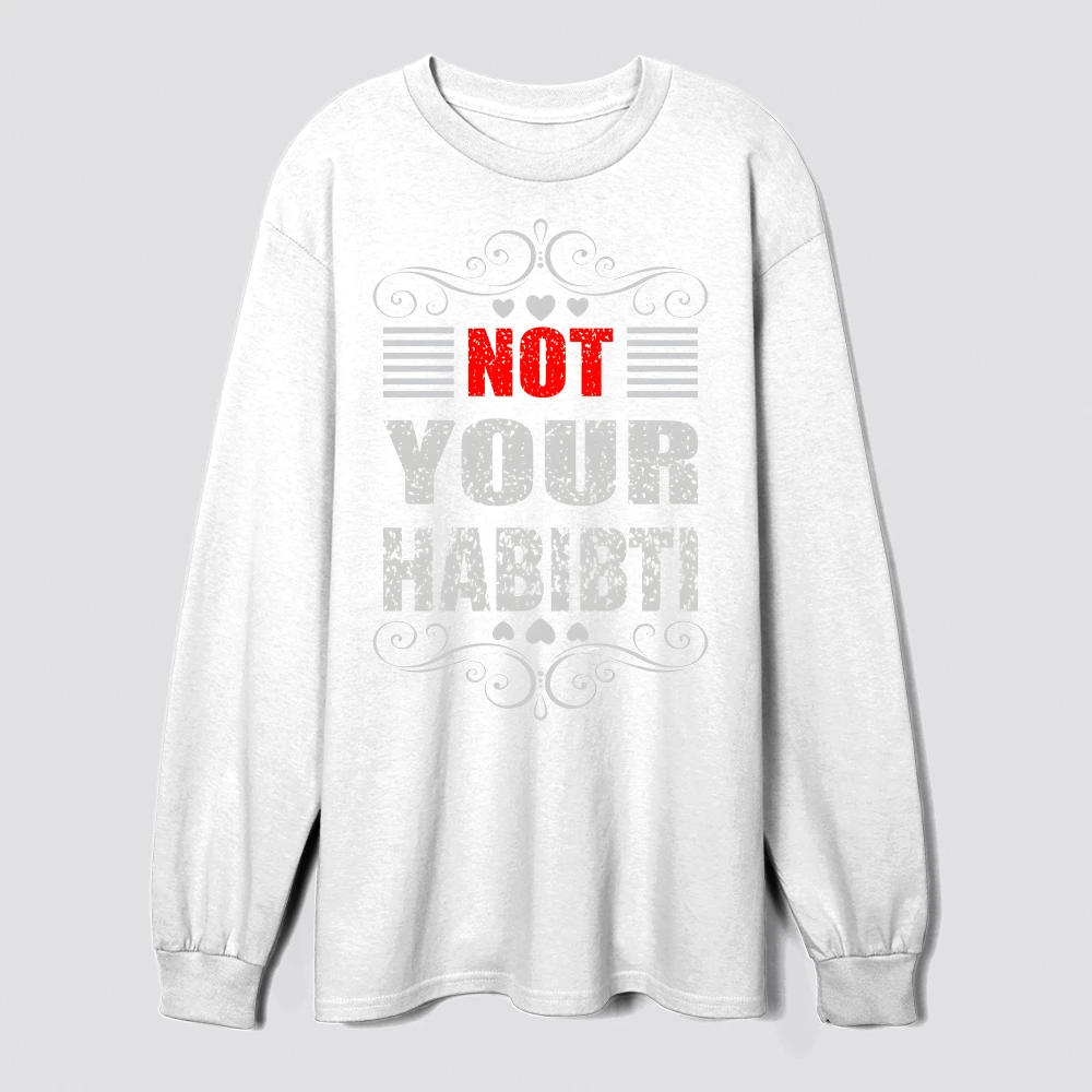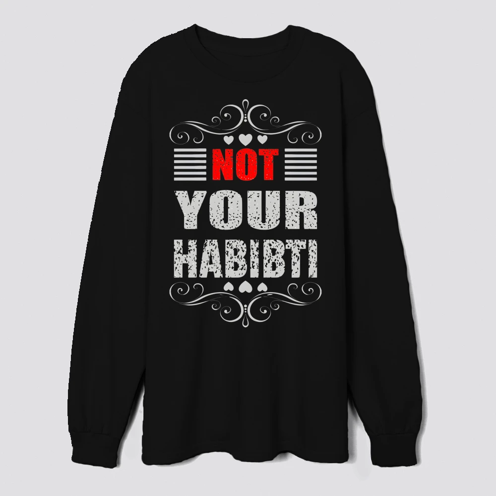 a bold graphic design featuring the phrase not your habibti in a vintage style with decorative elements and a striking red highlight focusing on personal empowerment and independence