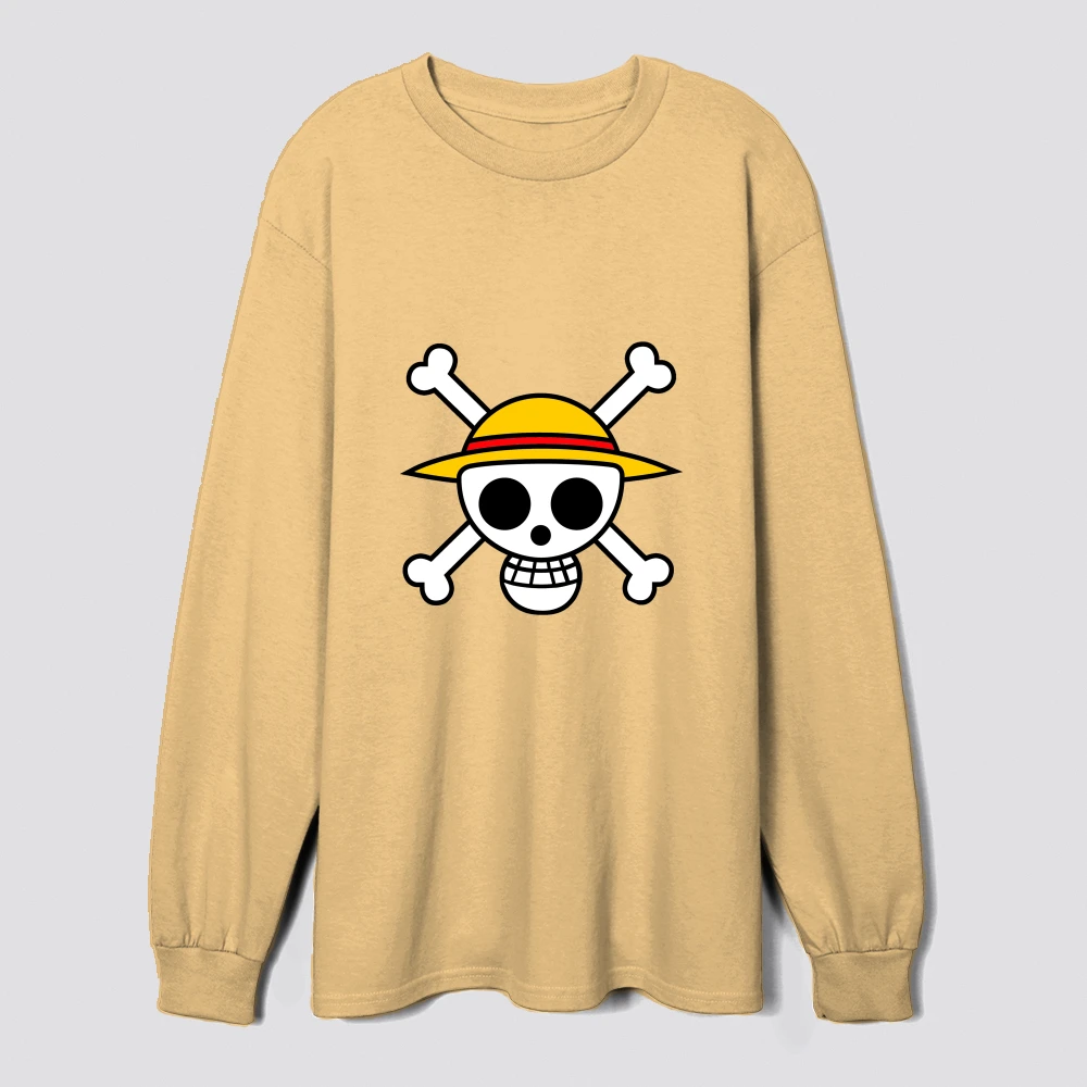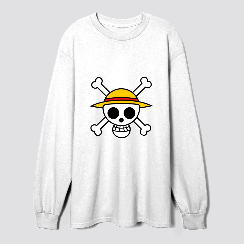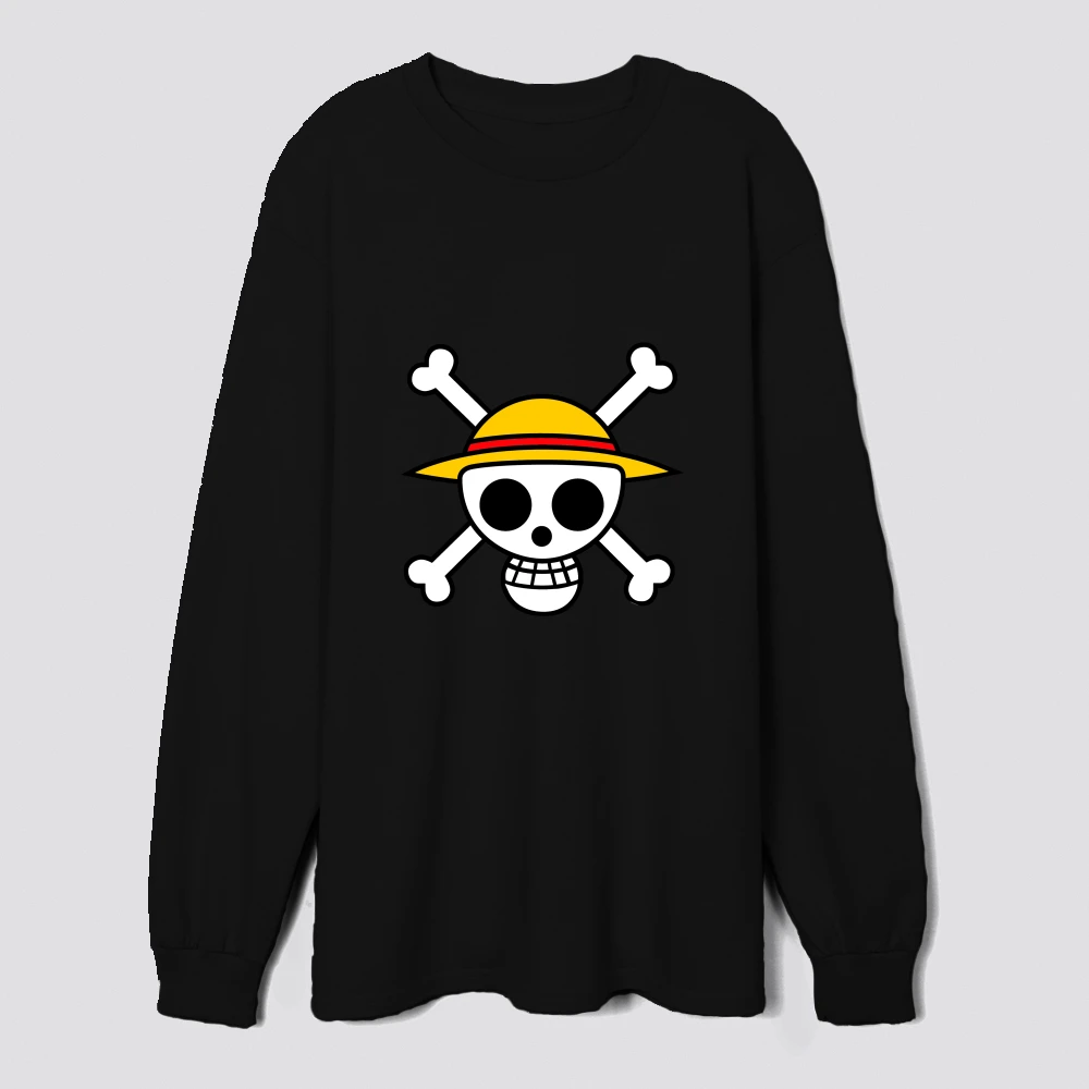 Embark on your own grand adventure with this officially inspired One Piece Straw Hat Pirates Jolly Roger long-sleeve t-shirt. Featuring the iconic skull and crossbones emblem of Monkey D. Luffy and his crew, this design is a must-have for every dedicated fan.