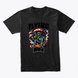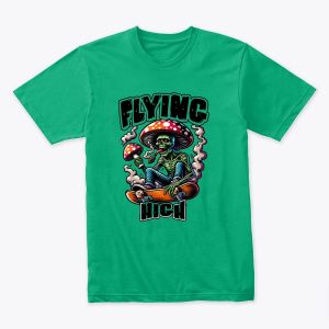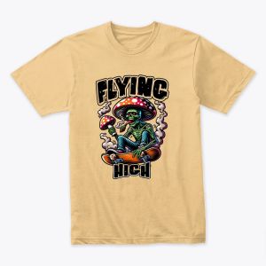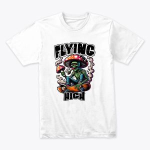 a vibrant illustration of a skeleton riding a skateboard wearing a mushroom cap surrounded by smoke with bold lettering flying high the image conveys a surreal psychedelic theme