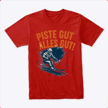 Dynamic t-shirt design featuring a silhouette of a skier in action with splashes of black ink and a German quote that means: "Slope good, all good!". Can be used on t-shirts, hoodies, and any other me