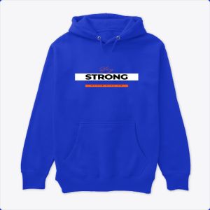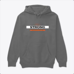 The design features bold, impactful typography. The word "Stay" is in a stylish, cursive orange font, while "STRONG" is displayed prominently in large black block letters on a white background. Below the main text, there's a motivational phrase, "Never Give Up," in black letters on an orange strip, reinforcing the message of resilience and perseverance. The overall design is simple yet powerful, making it suitable for an inspirational or motivational hoodie.