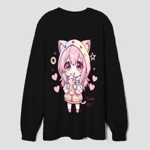 "شخصية أنمي تشيبي لطيفة ذات عيون كبيرة متلألئة، ترتدي هودي بلون باستيل مع أذني قطة، تحمل شاي بوبا، محاطة بقلوب ونجوم عائمة — ألوان ناعمة، أسلوب كاوايي، خطوط واضحة وسميكة، خلفية بسيطة، مثالي لتصميم تيشيرت مرح."