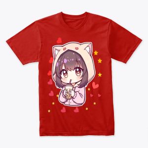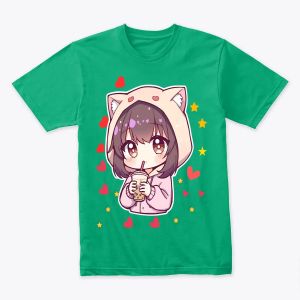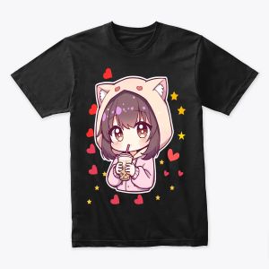 "شخصية أنمي تشيبي لطيفة ذات عيون كبيرة متلألئة، ترتدي هودي بلون باستيل مع أذني قطة، تحمل شاي بوبا، محاطة بقلوب ونجوم عائمة — ألوان ناعمة، أسلوب كاوايي، خطوط واضحة وسميكة، خلفية بسيطة، مثالي لتصميم تيشيرت مرح."