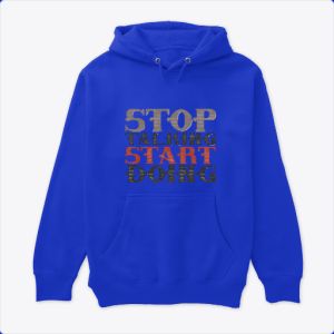 The design features a bold, vintage-style font with a distressed texture, adding a rugged and motivational feel. The words "STOP" and "DOING" are in gray and black, while "START" is highlighted in red, emphasizing action over words. The overall design has a strong, no-nonsense aesthetic, perfect for those who value determination and productivity. The simplicity and boldness of the message make it both impactful and visually striking.