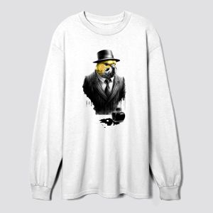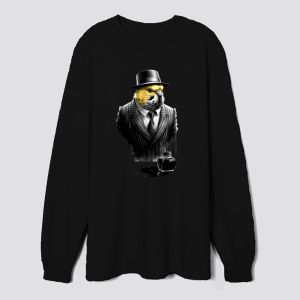 a parrot dressed in a pinstripe suit and hat standing beside an ink bottle the image blends anthropomorphic elements with vivid colors and sharp contrasts for a striking effect