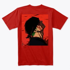 Set against a blazing red sky, the scene symbolizes unwavering willpower and sacrifice, perfectly reflecting the spirit of Zoro legendary swordsman.